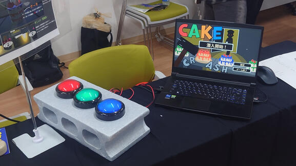 活動3 一般的な入力機器でのプレイが難しい 課題の解決対策 Xbox Adaptive Controllerと手のひらサイズのボタン4つを増設することで、簡単な体感ゲームを作成した。増設したボタンは軽い圧力で作動する。4つのボタンと4つのラケットの色が対応しているため、障害をお持ちの方でも、自身の位置を見失わず、容易にプレイ体験ができる。